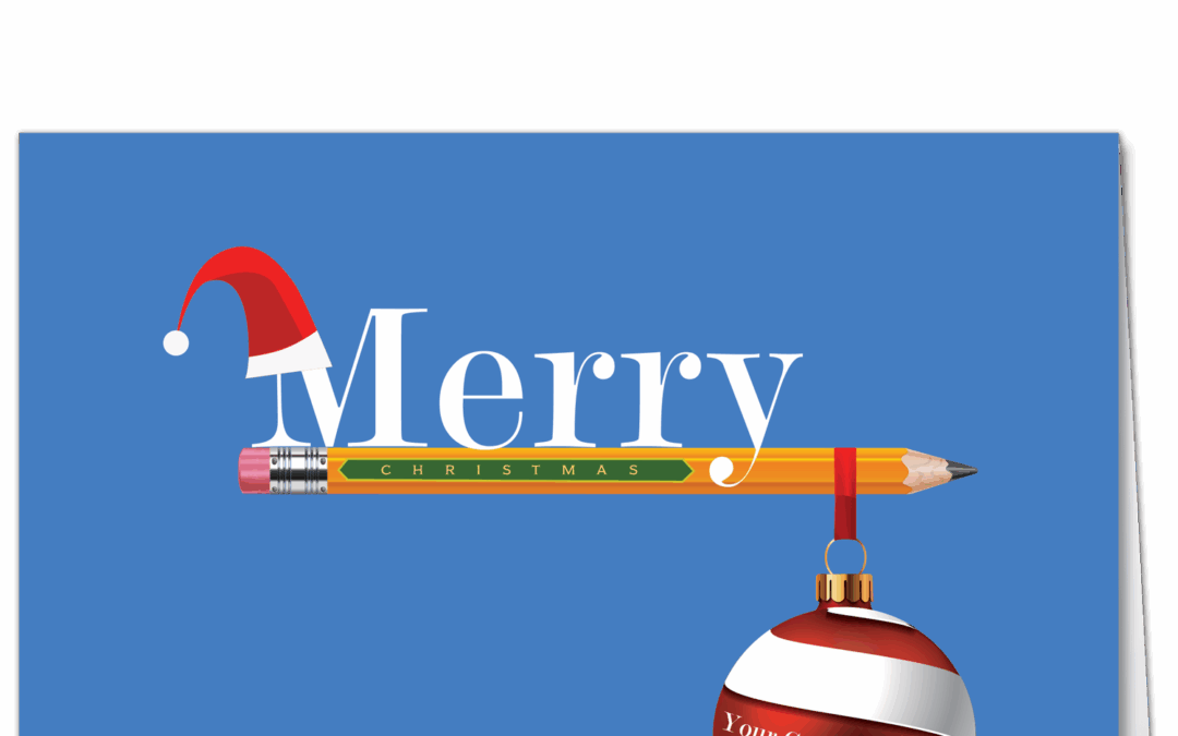A sharp little pencil supports a red-and-white striped ornament on this company Christmas card.