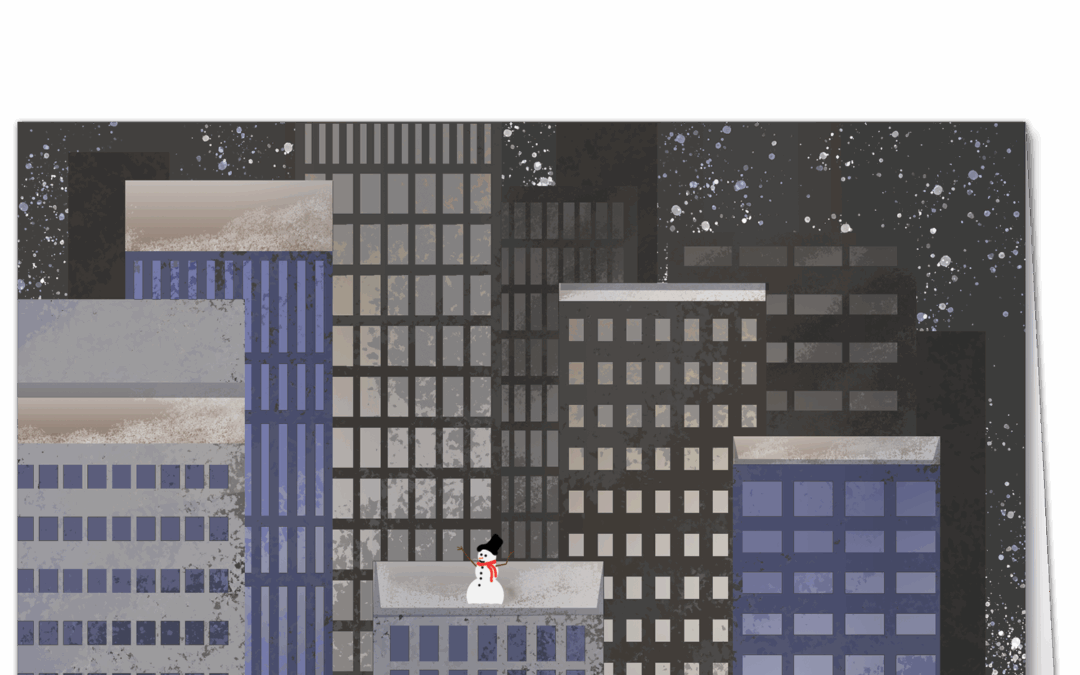 A business Christmas card featuring a winsome city scene that includes a merry little rooftop snowman.