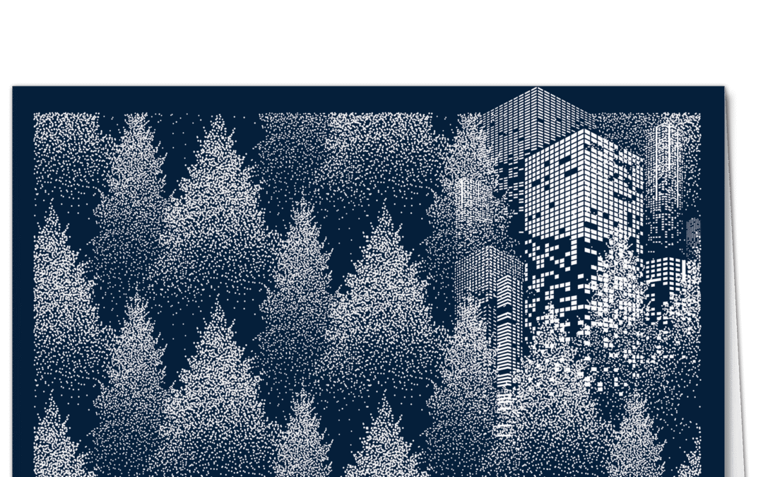 Modern corporate holiday cards featuring a pointillist forest in white on deep blue, and a whisper of a cityscape.