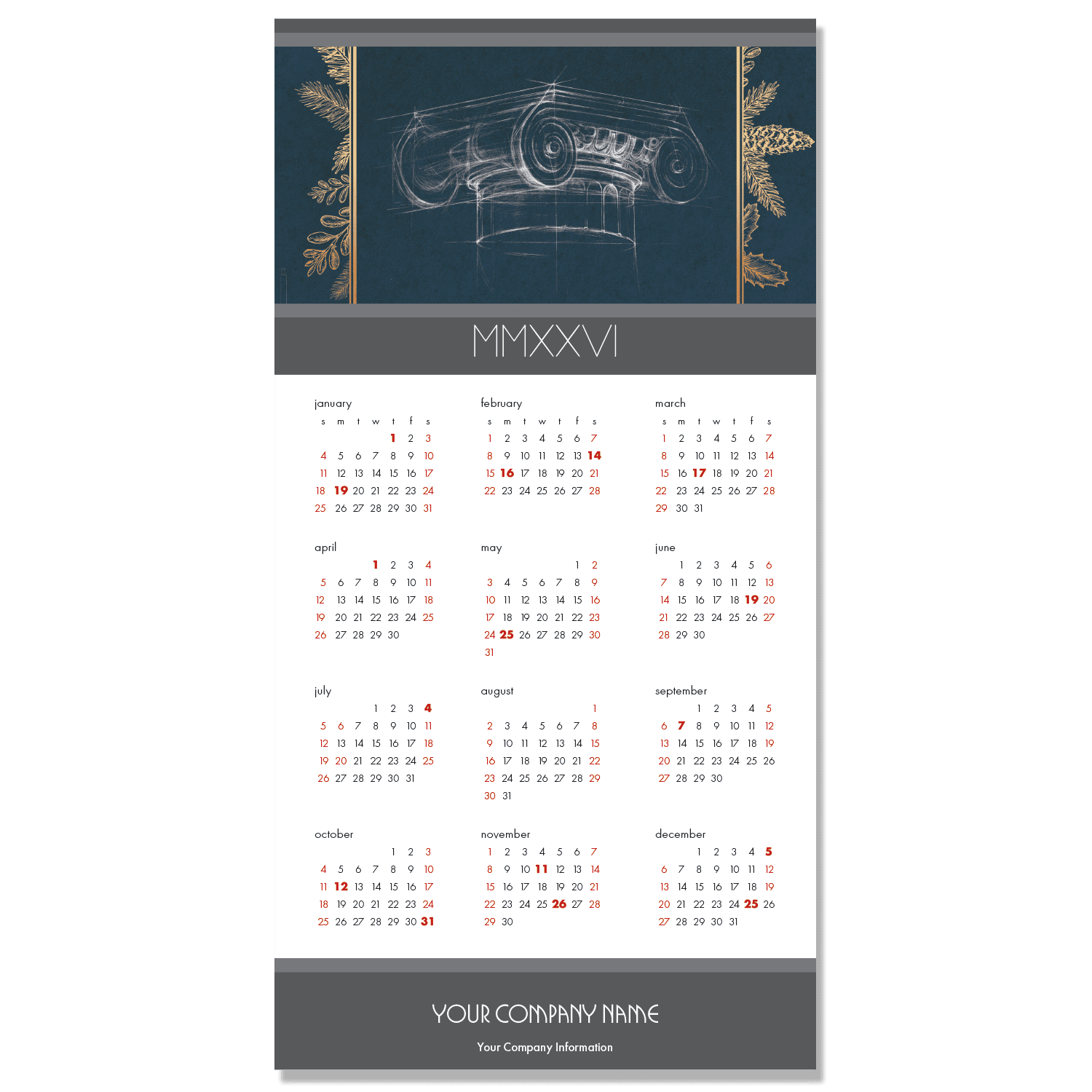 A classic slate blue and bronze design for the stylish lawyer, this Christmas calendar card will represent your firm in fine fashion. A breathy rendering of an ionic order is set off by fir and holly boughs, as well as a pine cone—one of nature’s most attractive mathematical symbols.