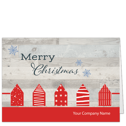 What fresh cheer is this?! Pale weathered wood makes such an inviting background for our five little red houses, all decorated up in playful doodles. Your company name will appear in the red band across the bottom of the card, and you get to pick the greeting set off by carefully-placed snowflakes. These architectural holiday cards convey a message of good cheer that is immediately recognizable. That’s the magic of a printed greeting card.