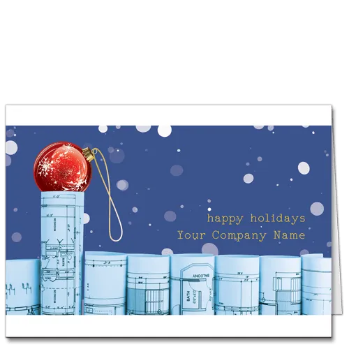 There’s just something about that neat little row of rolled up blueprints… This card features a flurry of snow on an indigo background, and a glittery glass ornament perched aloft. These are the blue hues of prestige and trustworthiness, accompanied by the warmth and promise of a shiny red charm. A sincere message of “happy holidays” appears with your company’s name on the front, typeset to your liking.