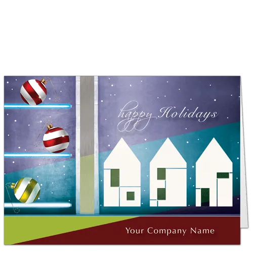A printer’s surprise sparks a bold aesthetic. This colorful design rips up the rule book on holiday cards… well, maybe just dog-ears a few of its pages. Directional bands of beautiful but unpredictable jewel tones peppered with a gentle snowfall set the background for these lively architecture firm holiday cards. Three little houses and three happy ornaments remind us that the season is always a festive family affair. A few touches of neon and a cheerful message with your company’s name brighten up the whole scene.