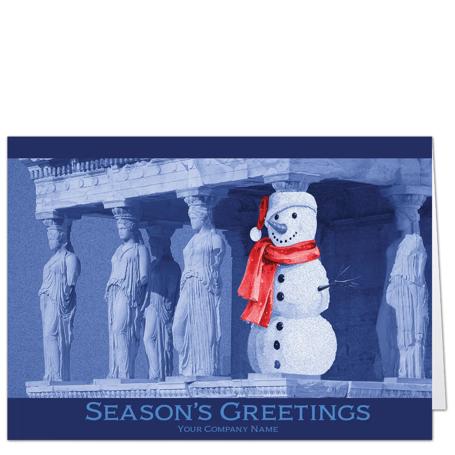 A cheeky little Greek snowman makes these architecture holiday cards a joy to send and to receive. Our snowman takes the place of the lost sister to support the carved stone porch. He “stands” out from the subtle blue shading with his bright red scarf. Set your company name on the front and choose your own typeface.