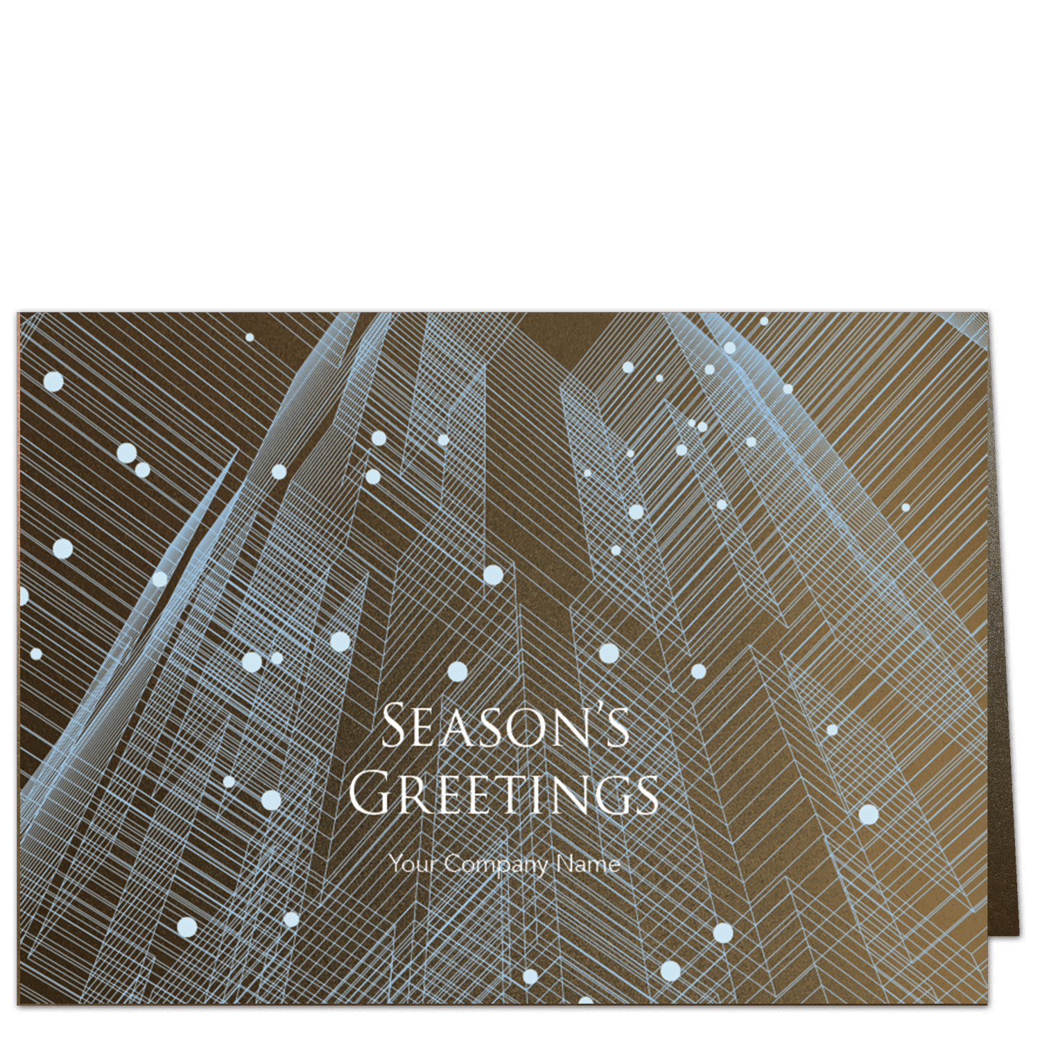 A breathtaking design on our SBO special card stock Bronze Metallic. Gazing skyward along the clean lines of a skyscraper rendered in the palest blue. The gentle snowfall invokes the wonder of Christmas eve, and your company name on the front will convey your well-wishes for the season.