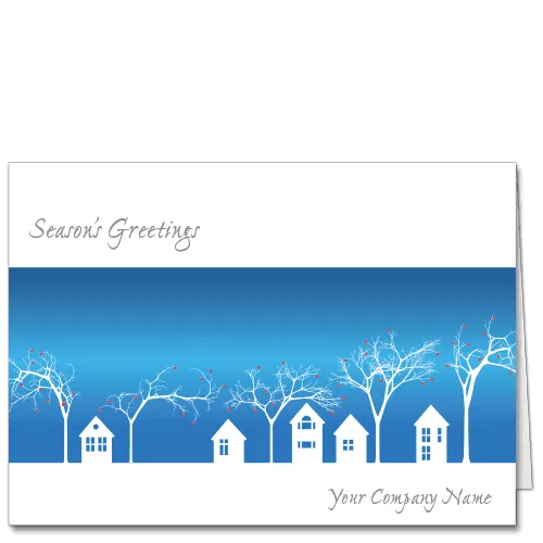 Cheerful houses between tall trees stand all in a straight row, on the front of this elegant holiday card for architects, engineers and construction contractors. The illustration is presented as a tasteful white reverse out of a horizontal business blue gradient, forming a band across the center of the greeting card. The tips of the tree branches are decorated with red Christmas lights, providing a subtle contrast color. At the top, the message “Season’s Greetings” is set in a cheerful holiday typeface; and below the illustration, we print your company’s name!