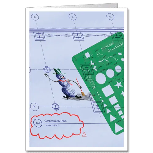 This playful holiday greeting card shows Frosty the Snowman artfully sketched on an architectural blueprint for project “Celebration Plan.” A drafting template is casually sitting atop the snowman’s building plans. It makes the perfect Christmas card for an architect’s office, engineering firm, or construction contractor to send out to clients to celebrate the holiday season.