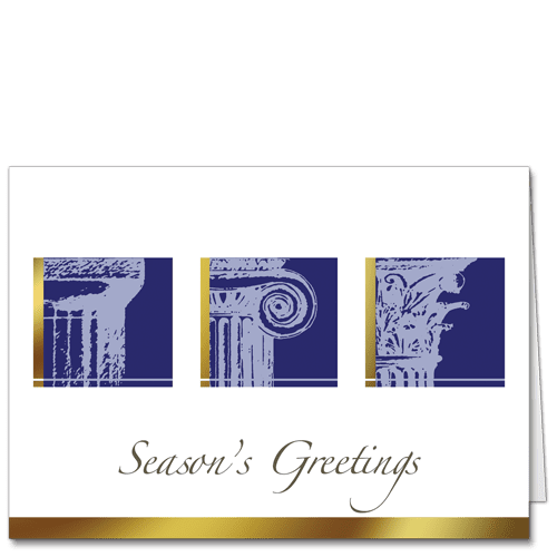 Printed on Cardphile’s premium card stocks, this classic design depicting Doric, Ionic and Corinthian columns in rich blue hues makes an elegant holiday card for architects. Accented with lush, gold accents along the column images as well as the bottom border, this design makes a fine corporate holiday card for law firms and financial institutions as well. Our designers recommend selecting our SGP Pearlescent card stock for a shimmery, standout look.