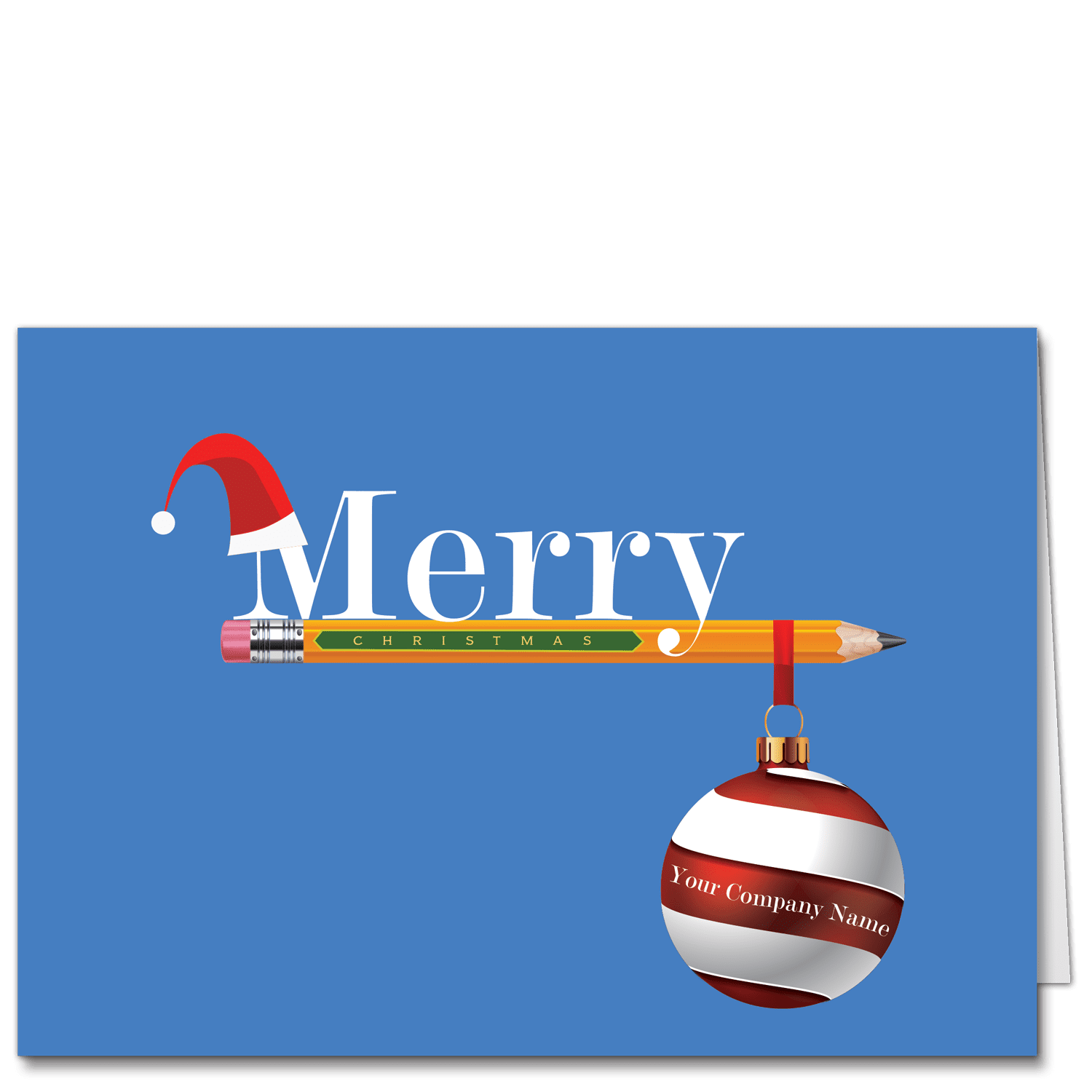The most festive pencil ever appears on this clever company Christmas card design. Choose your greeting bearing the Santa hat; “Merry Christmas,” “Happy Holidays,” or “Season’s Greetings.” They all look adorable, and while you’re at it, add your company name to the candy-striped ornament. Just hit the “design online” button and you’re ready to go.