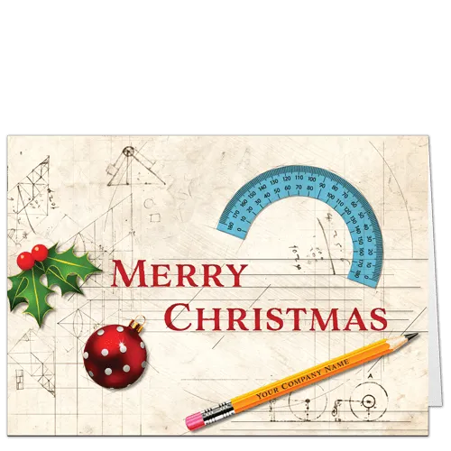 There’s a lot of fun packed in to this Da Vinci-inspired architecture holiday card design. Look closely, your company’s name appears on the pencil! The background is classic parchment, and the colorful elements—a protractor, a glass ornament, and a holly sprig—are pure whimsey. That bold, red message of “Merry Christmas” is interchangeable. Choose “Happy Holidays” or “Season’s Greetings” with a click when you build your architecture holiday card in our online editor.