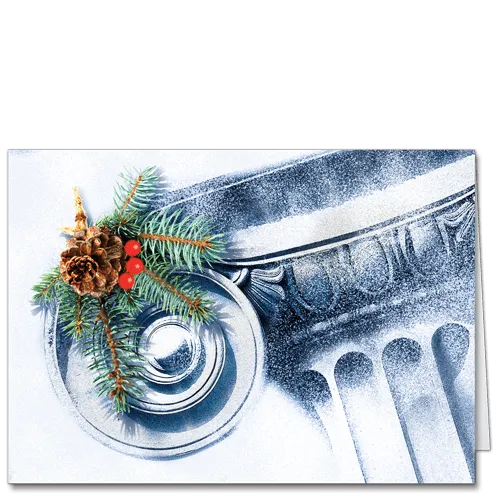 Select a greeting that will make a valuable impression. The classical capstone of an Ionic column is the visual theme when you send these lovely architectural Christmas cards. The column is rendered in precise detail and seen through a dusting of winter snow, giving it an ethereal quality. The spiral cornice piece of the stately column bears an inviting Christmas spray of evergreen sprigs, festive red holly berries, and a happy little winter pinecone.