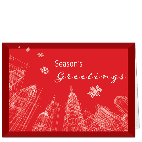 Let’s raise our eyes to the grand view of the city all around us! This cheerful red card puts the viewer on the ground, gazing up at the skyscrapers around her. The majestic pinnacles are rendered in sketch, and feature a variety of popular architectural styles. A few dazzling little snowflakes drift down delivering a sincere message of season’s greetings. A new favorite among our architecture themed Christmas cards, this design, enhanced with your personal touches, is sure to lift your recipients’ spirits.
