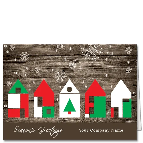 A classic holiday look to charm the heart. Cozy stylized houses in Christmas candy colors on a weathered wood background. Gentle snowflakes give the whole scene that touch of magic. This design blends traditional and modern aesthetics into what will be unique business Christmas cards, made truly personal with printed signatures, and other modifications.