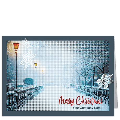 Imagine you’re riding in a carriage through Paris, or London, or New York on a serene Christmas eve. The horses have just crossed a bridge with lovely stonework rails and lamps aglow. The snowy scene on this card is viewed through a screen, by a passenger with possibly a woolen blanket warming her lap, and her favorite friend by her side. The message “Merry Christmas” looks as though it was hand-lettered with a Victorian-era fountain pen. Your company’s name is set right under the jolly red greeting so the recipient will recognize your goodwill—and good taste—immediately.