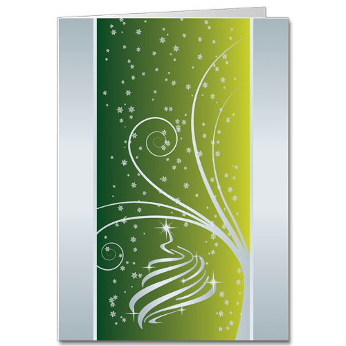 A vertical band depicts swirls of silver and a magical shape of a little Christmas tree (or is it an ornament pretending to be a tree?). The background is a fetching gradient of greens sprinkled with snowflakes. This elegant design will make your business Christmas cards truly memorable.