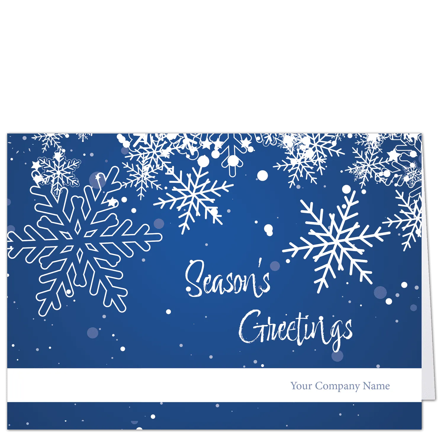 Bright white snowflakes dazzle on a true blue background, this simple but dynamic design reflects your sincere well-wishes for the holidays, as well as your good taste. Add your business name right up front and consider adding your logo inside your holiday cards, especially stunning if it happens to be blue.