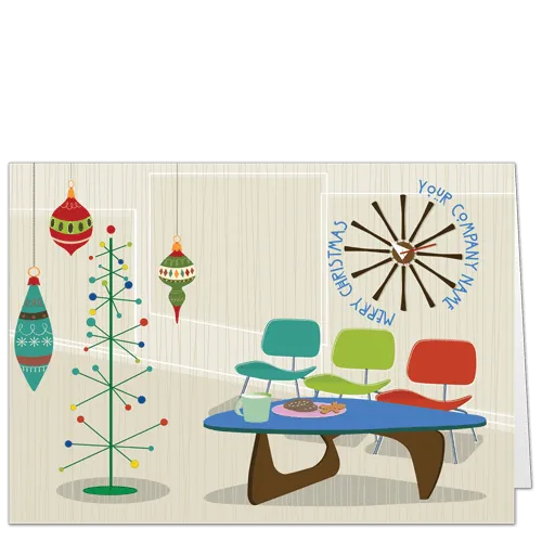 A waiting room or office reception area most merry—and most retro! A coffee table and colorful chairs in the 60s style set the scene with the obligatory sunburst wall clock. (don’tcha just LOVE those!) A spritely little Christmas tree and a trio of other festive decorations hang out, while an inviting plate of cookies waits for a visitor. This design looks best customized with your company name.