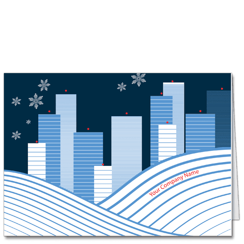 These business holiday cards sport a minimalist illustration of an urban skyline on a clear night. Skyscrapers of varied heights are arrayed behind the striated snowy hills rolling in the foreground. A field of flowery stars fills the night sky of this crisp design, rendered in shades of business blue. Your company name, as you would like it typeset, is added to the front of the card in brightly contrasting Christmas red lettering, elegantly integrated into the design. This is a perfect holiday card for urban planners, civil engineers, architects, construction companies, and professional firms. Browse some of our collections of industry specific holiday cards: Architects Christmas Card, Engineer Christmas Card, Construction Christmas Cards, or even something highly specific like this design for the electrical engineering holiday card called Holiday Transmission, which would be great for any company in the lighting or energy field.
