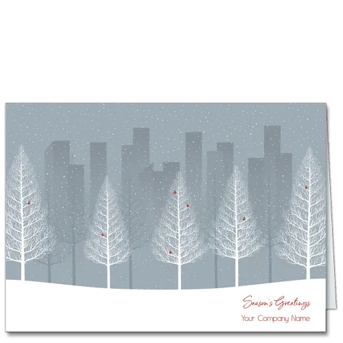 A silky grey background belies a gentle snowfall in an urban park setting. You can just see a magnificent skyline behind the pretty, white, stylized aspens. The soft accumulation of snowfall creates a perfect place for your affectionate greeting and your company name typeset to your liking.