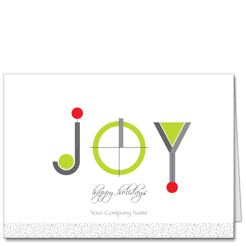 Shapes, and strokes, and points, and curlicues. Are those olives and cherries, or ornaments? I guess it depends on how merry your Christmas is. (wink, wink) This modernist design features lime green and grey strokes and curves creating the word “Joy.” A playful, pen stroke font sets the greeting “happy holidays” and your company’s name is set below that to let the recipient know exactly who’s sent them an envelope full of holiday joy. A subtle, pointillist border along the bottom supports the entire tableau.