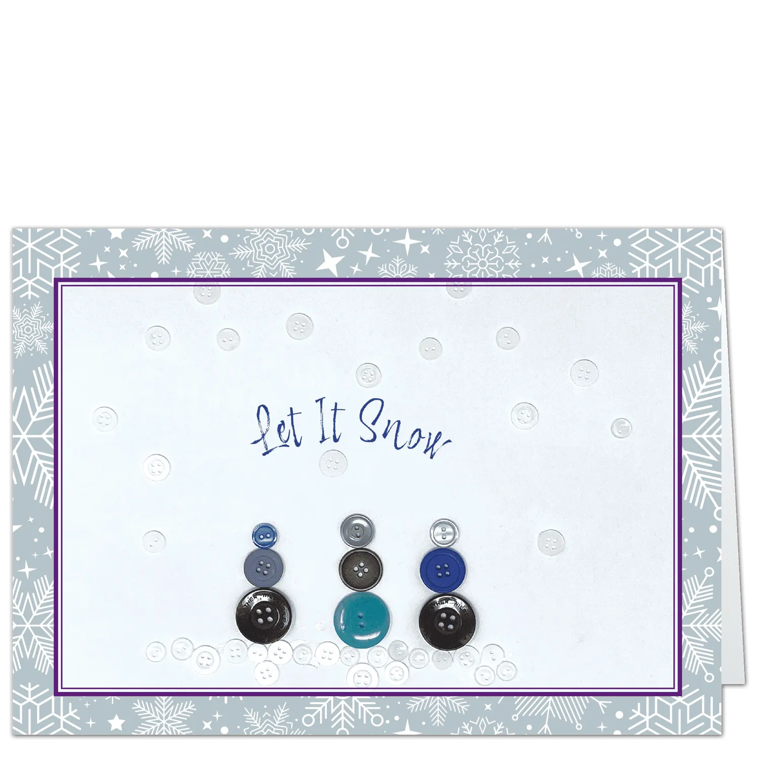 An adorable button snowman family by a Doernbecher patient will bring smiles to all your holiday card recipients. Design online to add your company or family name below the greeting inside ~