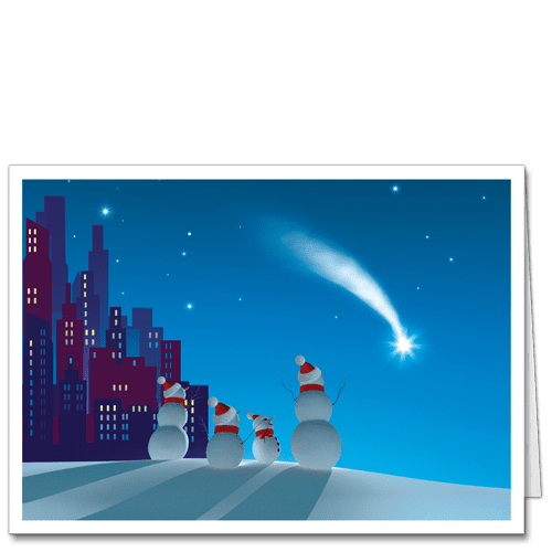 Brilliant light cast by a shooting star illuminates a family of snowpeople, each wearing a red Santa hat and scarf on the front of this construction Christmas card. In the background is an illustration of city skyscrapers, with lights glowing through their windows in the night. These marvels of architectural engineering are a testament to the construction prowess of the modern era. Send your best wishes of holiday cheer to your company’s clients with this elegant and joyful greeting card.
