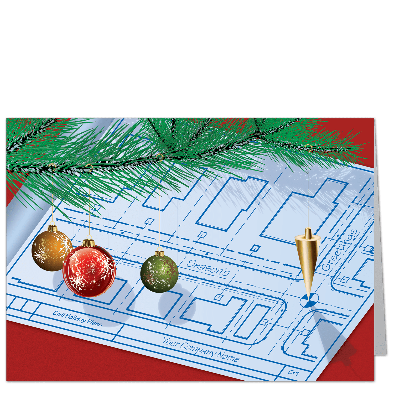 These engineering Christmas cards are a great option for any engineer or engineering firm to send to clients and friends. This design depicts sparkling baubles hung from a single Christmas tree bough, dangling above civil engineering blueprints. A golden plumb bob ornament is centered over the control point—indicating the intersection of business and holiday fun!