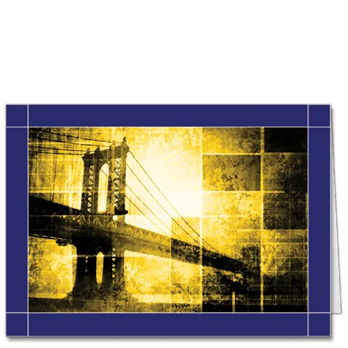 The trestle towers of a massive suspension bridge are rendered in a gritty modernist textured style on this structural engineers Christmas card. The design shows through a graduated filter, lending the scene a golden hue, as of bright sunlight, prosperity, or the halcyon days of youth. A subtle pattern of textured boxes of varying transparency is overlaid atop the photorealist image as though the scene were viewed from behind panes of frosted glass. The borders of the card are a professional business blue, making this the perfect holiday message from your firm.