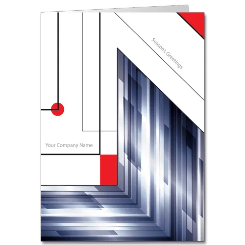 Glimmering blue/grey geometric texture converges at a right angle, juxtaposed by bright red accents on a white background. These are no ordinary building materials, but an artistic vision of the strength and reliability in every well-designed project. A sincere message of “Season’s Greetings” is typeset on the front in a clean, san serif typeface along with your company name. Send a holiday greeting that will be remembered and appreciated.