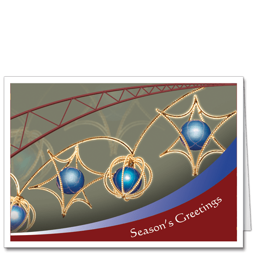 Cheerful Christmas tree ornaments dangle from the cross-bracing of a well-engineered bridge or abstract architectural structure, on the front of this holiday greeting card. Each ornament is surrounded by a glowing golden filigree, wrought in a shape perhaps reminiscent of the star of David, or of the shape of the Earth. Each ornament has at its center a glowing ball of corporate blue. The lower right hand corner is a rich holiday maroon, with a “Season’s Greetings” message fit to the shape of the curve. Corporate drab and blue colors complete the tasteful color palette. Engineer your way to holiday cheer with this architectural holiday card.