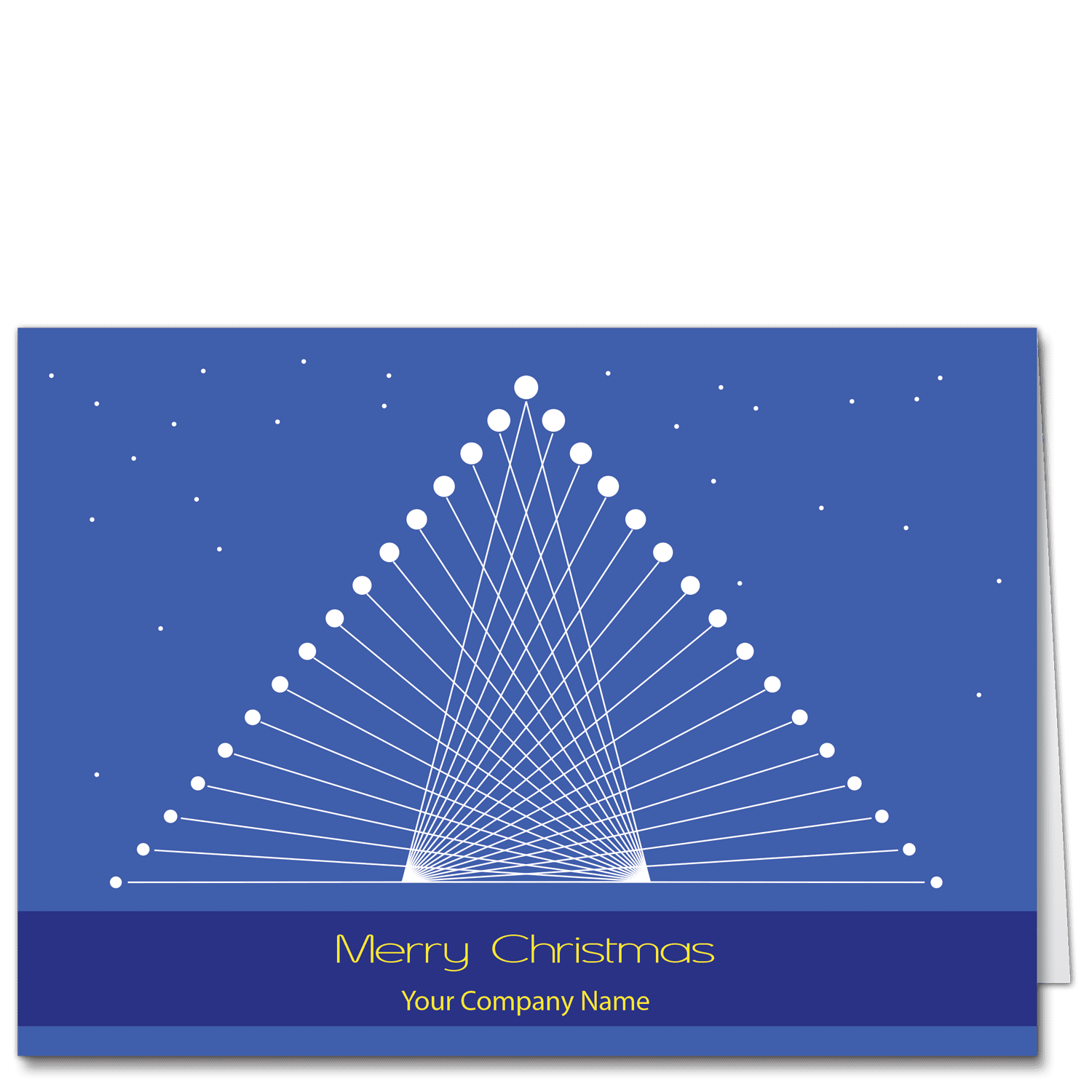 A simple illustration of points and lines form a structural engineering Christmas tree rising skyward on a true blue background. This taut little tree is complemented by a scattering of random pinpoints of the same pale light—stars in the holiday sky. A darker blue band at the bottom bears your structural engineering firm’s name and a heartfelt holiday card message.