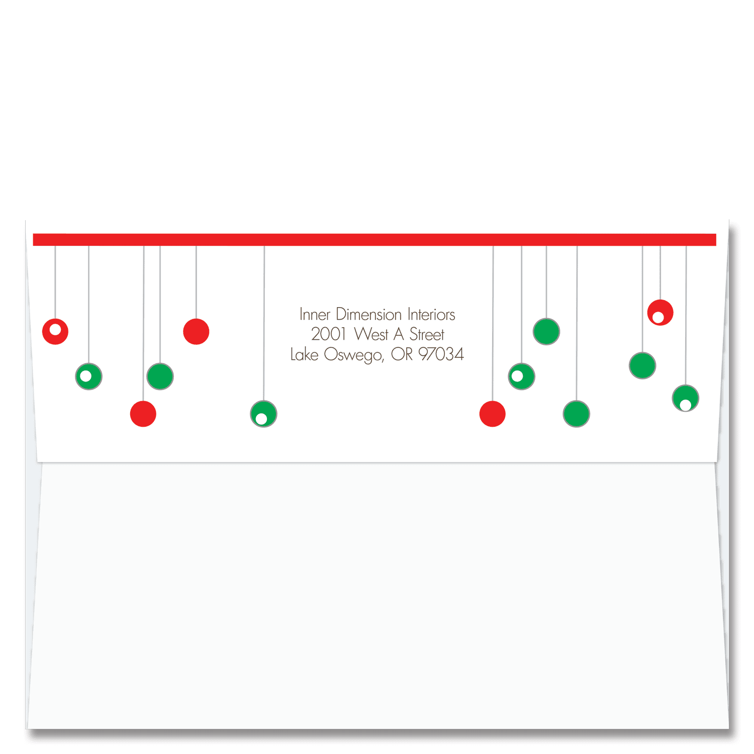 Personalize online and your address will be printed as shown, below the festive red and green ornaments on these premium, self-sealing envelopes ~