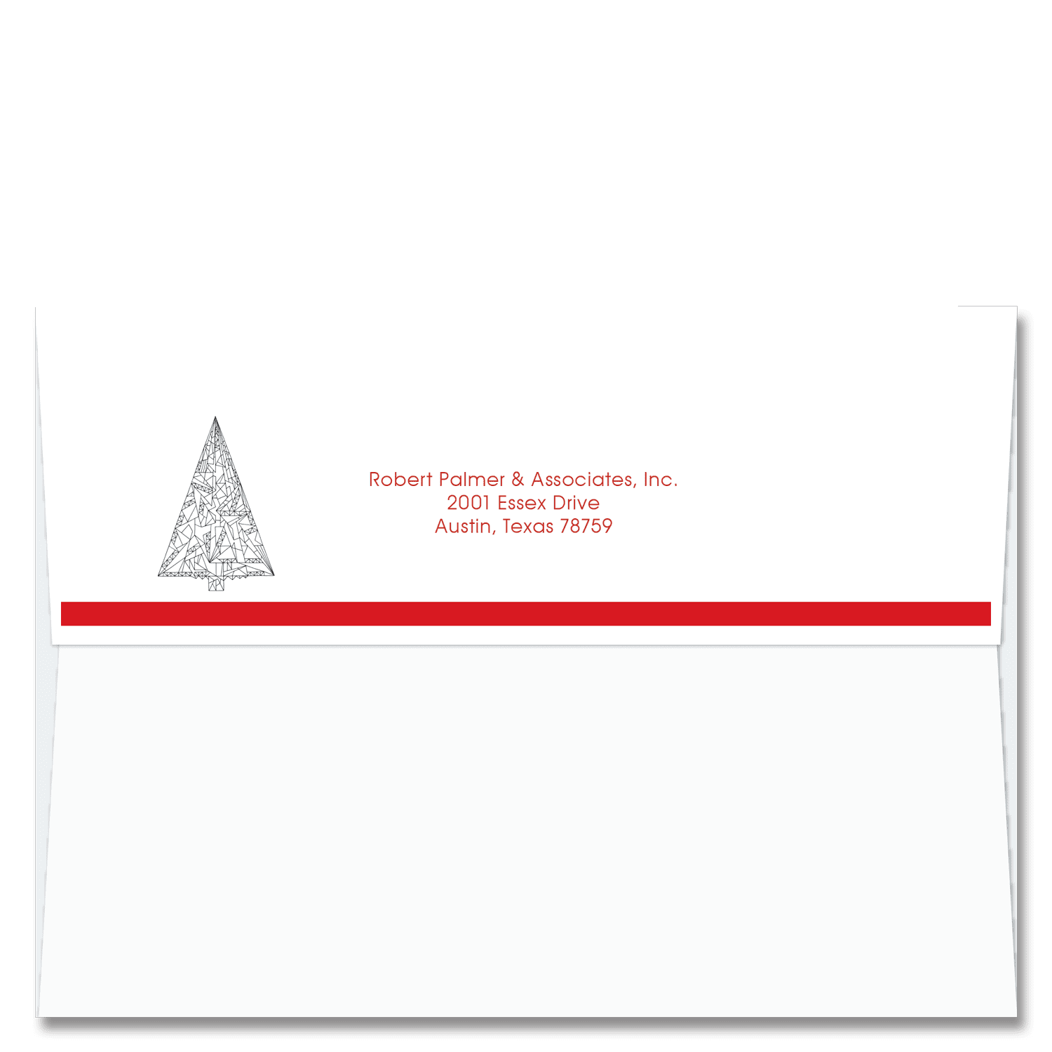 Christmas card envelopes with a red band and a stylized black line tree drawing frame your holiday card return address. Personalize these festive self sealing envelopes online ~