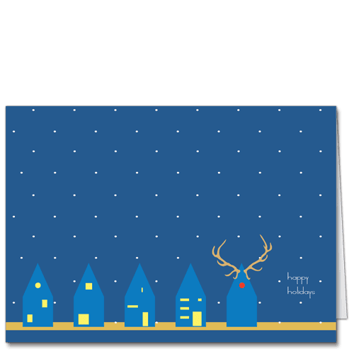 One of these houses is not like the other, on the front of this humorous holiday greeting card for engineers. The business-blue background with the perfectly symmetrical pattern of snowfall, and the row of business-blue houses in the foreground, give the first impression that this is a serious holiday card for only the most serious of firms; but then the fifth house unexpectedly has a red nose and reindeer horns! Rudolph the red-nosed house will guide the sleigh to holiday cheer for your construction clients this year. In the lower right-hand corner is the message, “Happy Holidays” in an understated architectural font.