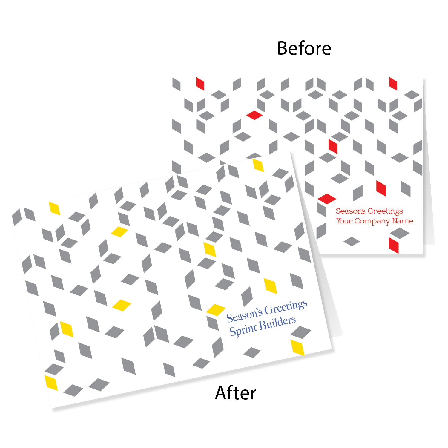 Want to have one of our holiday card designs modified and customized just for you? This will do the trick! Add this product to your order (+$85.00) to cover most basic card front mod requests*, such as changing some colors to match your corporate colors, or tweaking the design in some way, just as we did here with our personalized Architectural holiday cards Cascading Plains 3770. This fee also includes adding your full color logo to the card front at the same time if you wish – see below for more info.