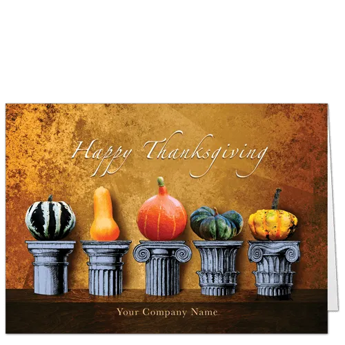 Who doesn’t display their Thanksgiving gourds on classical columns? Customize these architecture Thanksgiving cards with your company name front and center, and stand out from the crowd this holiday season. Five festive gourds sit in a row atop Roman (or Greek, if you prefer) columns. Your recipients will have fun picking out the styles of the ornate carvings. The warm and inviting background completes the old-world aesthetic with a timeless grunge texture in tones of orange and red and the message “Happy Thanksgiving.”