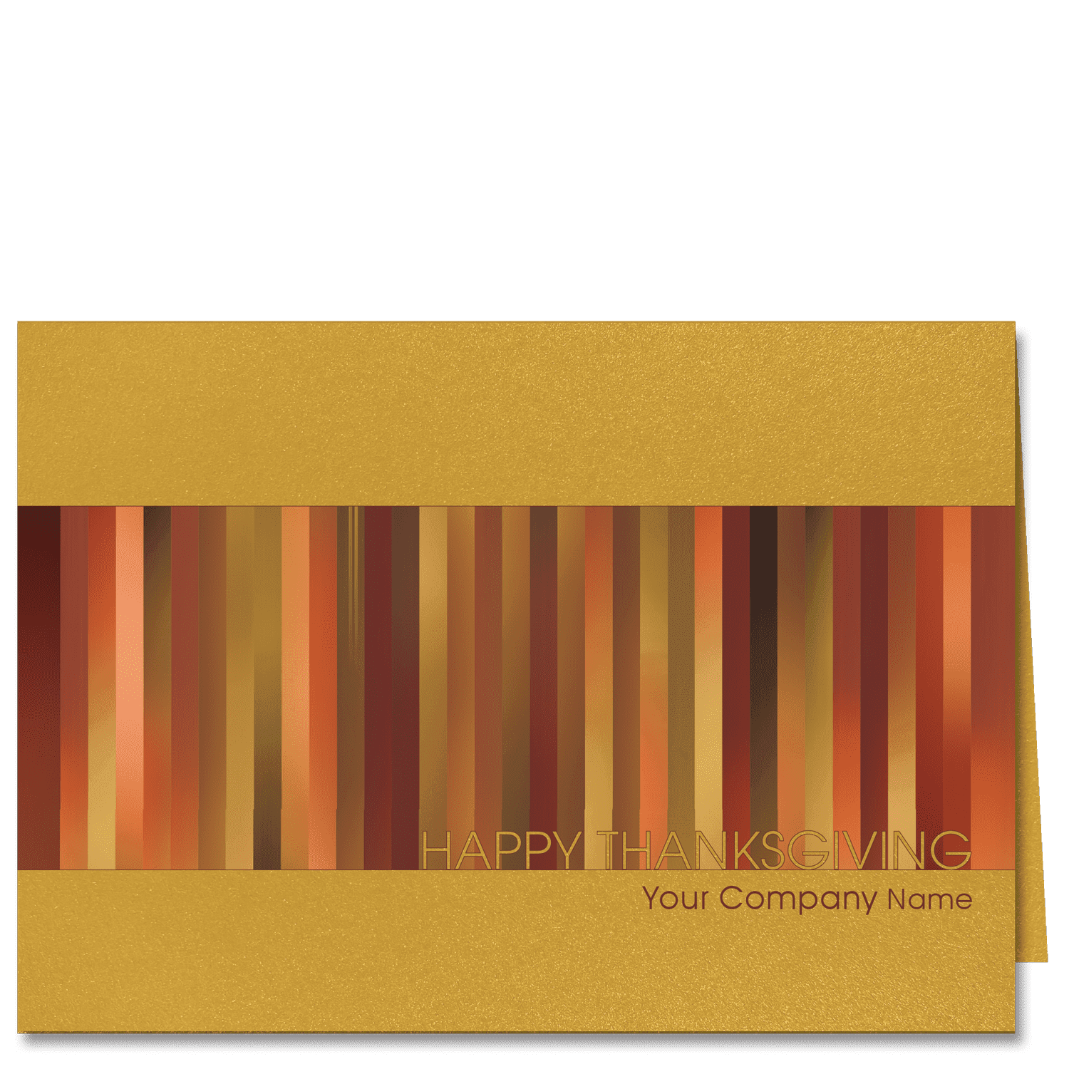Ribbons of claret, coral, umber, bronze and Van Dyke brown seem to glow and dance. Earth tones never looked so elegant as on this business Thanksgiving greeting. These cards are printed on a fine-quality gold heavyweight stock. Add your custom design work, and you’ll impress just about everyone on your holiday list.