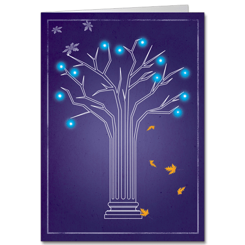 A classical pillar grows and transforms into a tree, on the front of this architectural holiday card. The base of the Ionic column is rendered in blueprint line drawings of engineering precision. As the tree undergoes its holiday transformation, the craggy branches are decorated with glowing lights of pale corporate blue. The background of the card is a deep indigo-violet gradient. Snowflakes fall on the tree from above; autumn leaves fall from the branches below. This elegant card sends a tasteful holiday greeting to the clients of your construction company, architect’s office or engineering firm.