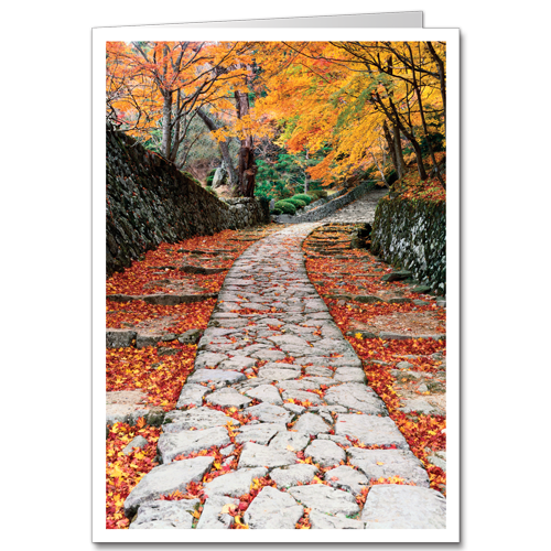 An Old Stone Path With Falling Autumn Leaves Make This a Very Inviting Thanksgiving Card for Business or Friends ~